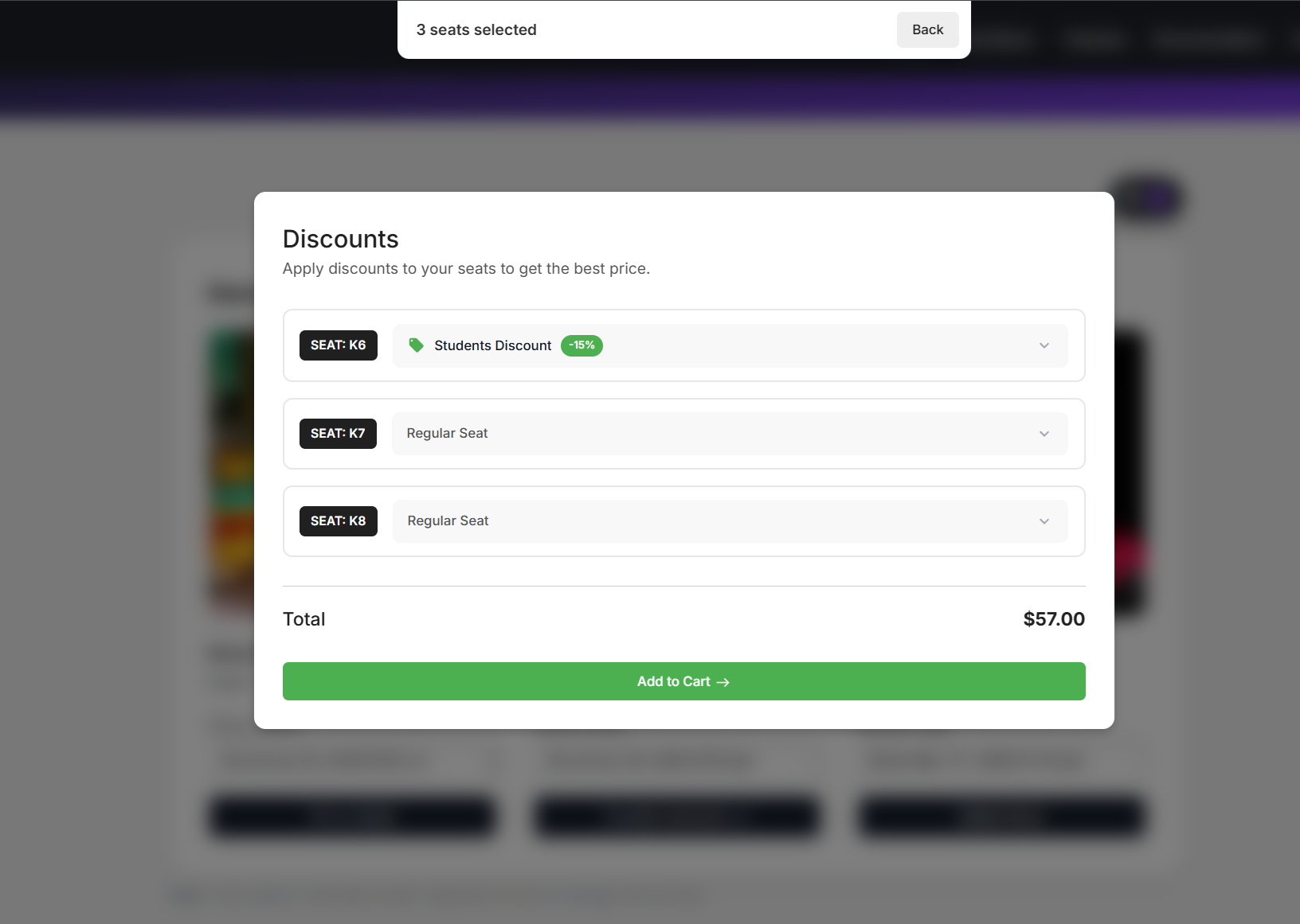 - Seat Reservation: Seats added to the cart are reserved for a configurable duration, preventing others from selecting them.